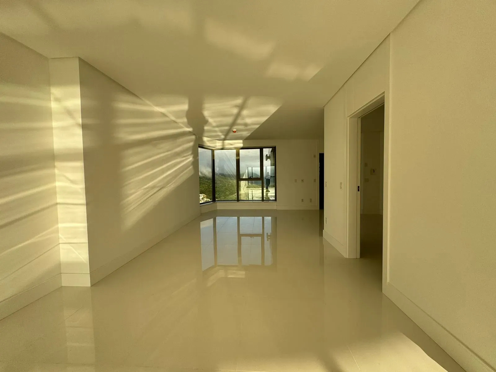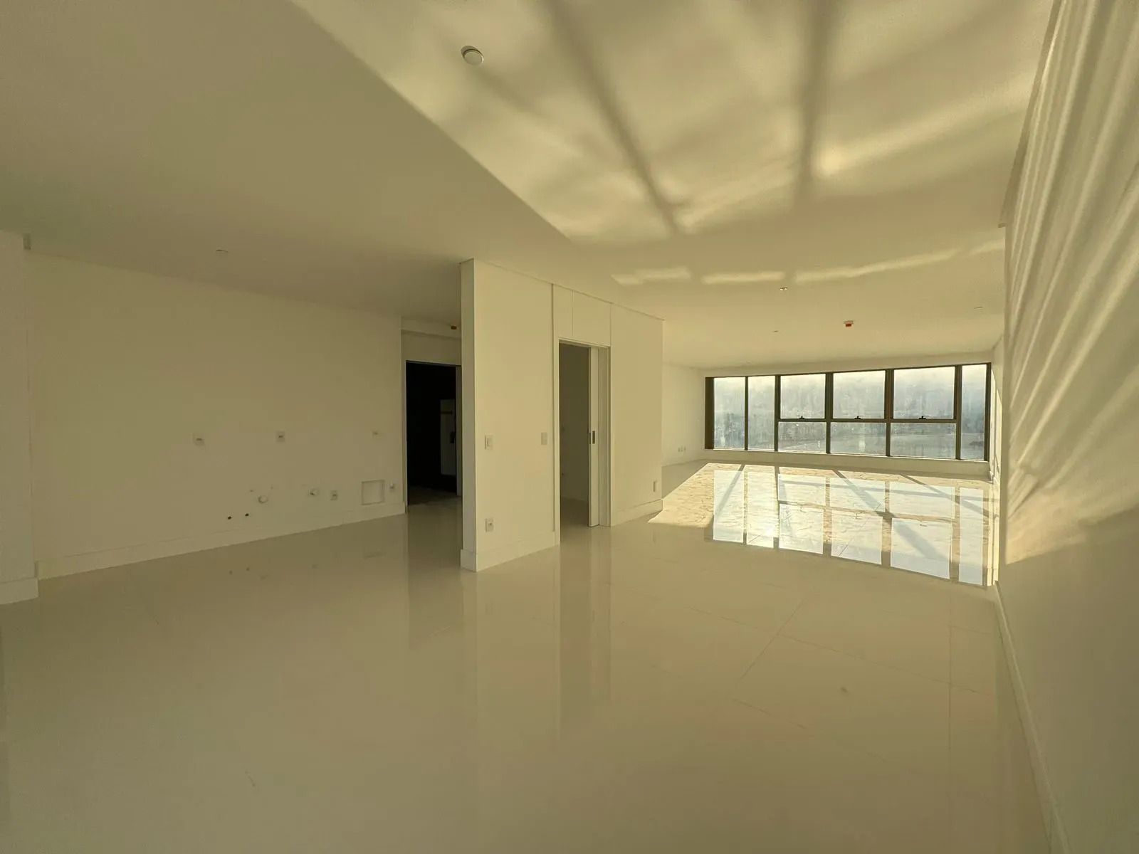 - Piso porcelanato indiano com medidas de 80x80m na área de uso comum do apartamento;
