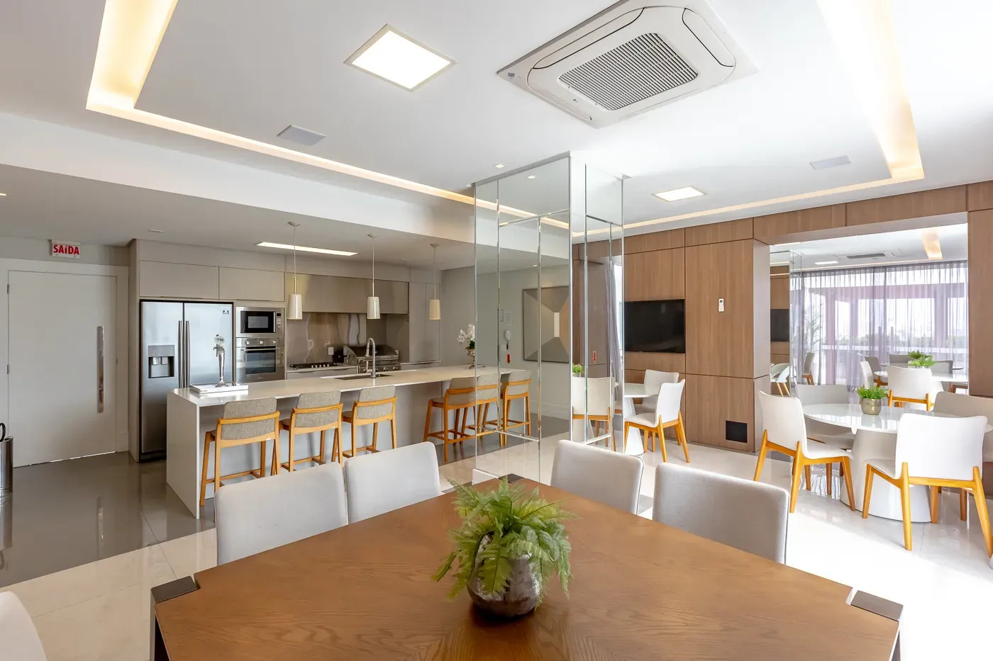 Ambientes amplos, integrados, com living composto por sala de estar, sala de jantar, cozinha em conceito aberto com bancada e espaço gourmet com churrasqueira.