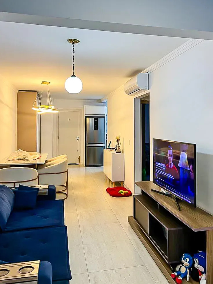 O imóvel está totalmente mobiliado, com móveis novos (menos de 1 ano), incluindo ar condicionado, geladeira, e mobília na sala de jantar e sacada.