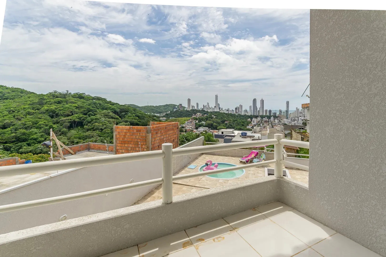 O imóvel tem um grande living aberto com piscina e uma ótima vista da cidade de Balneário Camboriú.