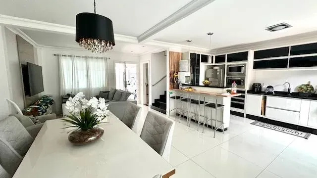 TÉRREO: Living integrado, sala, cozinha e sala de janta amplas, lavabo e área de serviço + 03 vagas de veículos porte grande.