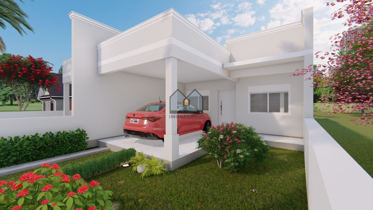 Geminado com 2 dormitórios, sala de estar/jantar, cozinha, área de serviço e garagem, com lareira e churrasqueira e área de 91,90m², mais pátio na frente e nos fundos.